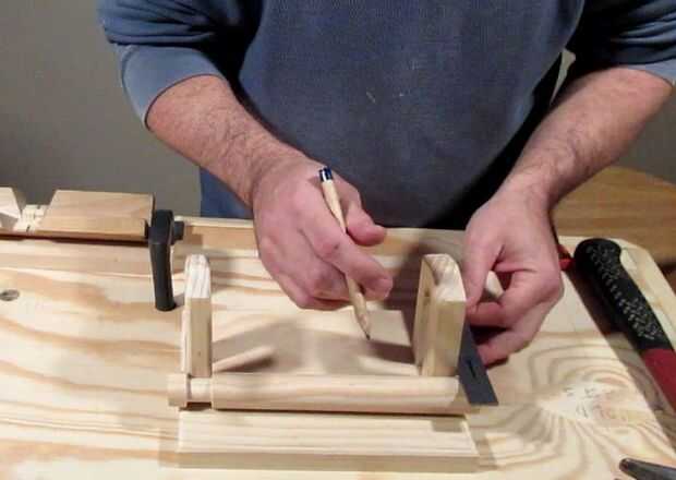 Primero encontré el centro de la espiga (4 1/2") y mide 3 1/8" (la mitad de 6 1/4") de ese punto. Este representa el interior del hombro de la muesca. Entonces medí otro 3/4" más lejos para el otro hombro. Asegurándose que los extremos de la espiga eran cuadrados, describen ambas líneas con mi gramil. Utilizando un cincel, fue todo lo inútil de las líneas del gramil cavar una "trinchera" para ayudar a mantener mi sierra sigue recto.