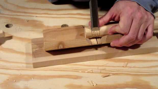 Cambié a mi sierra para definir los hombros - corte a la profundidad de los dientes de la sierra, todo el camino alrededor de la espiga. Hice algunos cortes de alivio extra entre los cortes del hombro para ayudar a picar a la basura. Entonces empecé a picar hacia abajo hasta la profundidad de los cortes y repitiendo este corte y cincelado del proceso hasta que la muesca tenía un diámetro de aproximadamente 3/4". Esta parte es un poco complicada - tomarlo lento y cuidadoso, asegurándose de que tiene una forma segura de mantener su trabajo.