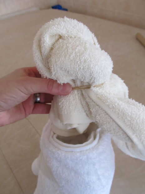 6. meta una esquina abierta del lavado de ropa en la parte frontal del cuerpo entre los pliegues y un rincón abierto en la parte posterior del cuerpo. (creación de un manga) Nota: Las mangas ayuda a asegurar la cabeza en su lugar, métalos tan firmemente.
