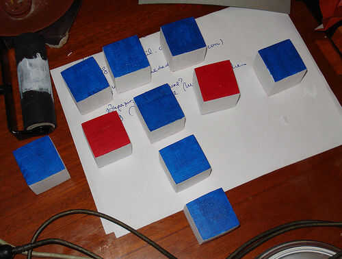 Cada cubo debe ser pintado con el blanco de un lado, un lado negro, uno rojo y uno azul. Uno de los cubos debe tener el lado rojo marcado con una mancha blanca, y otro cubo debe tener el lado azul de la misma manera: los cubos serán las Bases.