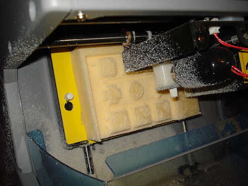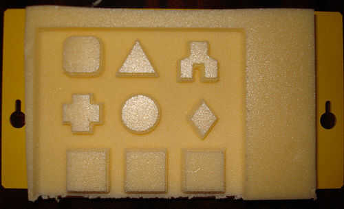 -El segundo dos cuadros muestran una máquina CNC, un pequeño Roland Modela MDX-3 que conseguí en ebay, mecanizado de las piezas hacia fuera de un bloque de espuma de poliestireno amarillo y las piezas mecanizadas. Esta máquina es increíble! De manera similar, cuando hice el primer prototipo que imprimí las formas, entonces yo cortar desde una placa de poliestireno. Realmente sólo puede imprimir y cortar de un pedazo de cartón.