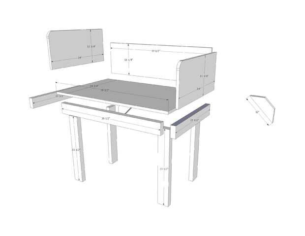 El dibujo muestra las dimensiones de las piezas en una vista explotada. Cuando usted elige dónde cortar cada pieza de sus tablas, piensa sobre que superficies se ocultará por el colchón, que superficies deben ser libres de astillas para la seguridad del bebé, y que las superficies deben estar bonitas porque son visibles.