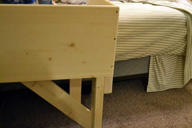 Poner las tres piezas de 2 X 4 horizontales en la parte inferior de la caja de colchón. Coloque las piezas laterales de 23 1/2 primero, haciéndoles a ras con el borde posterior. Usted necesitará ángulo los tornillos un poco al tornillo de abajo a través de la caja en el 2 X 4 sin rayar los lados, pero no es difícil hacerlo si usted tiene cuidado. Cuando sujete el 2 X 4 de frente a la caja, asegúrese de que usted pre-taladre todos los agujeros porque sería fácil dividir el tablero con todos los tornillos en línea. Para terminar esta parte, utilizando un par de tornillos de 2 1/2" para fijar el extremo 2 X 4 a la media. A utilizar los tornillos de 2 1/2" para el resto de la Asamblea.