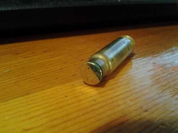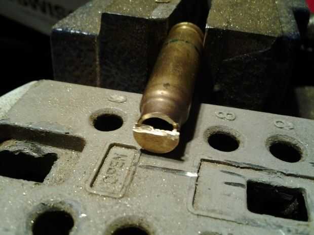 Cuando la carcasa de la marca mide 5/8 '' de la base y hacer una línea. A continuación gire la cubierta a la cabeza de la .22lrmark entre 1/4-1/3 de la cabeza. Agujero tiene que ser justo obtener buen sonido para ir más pequeños primero porque siempre tendrá más apagado si es necesario no volver... Después que se marcó 5.7 en tornillo de apriete y lentamente y con cuidado comience a presentar o encender tu dremel y rápidamente y con cuidado cortar las áreas de marcada. Ahora que las piezas se recortan suave las áreas ásperas. No estamos terminados con las tripas del silba todavía ninguna soldadura o adhesivos.
