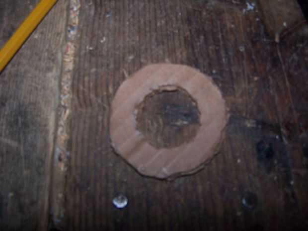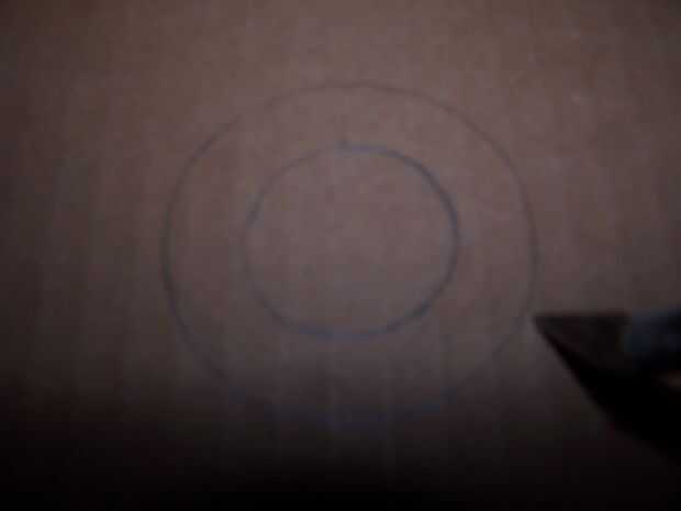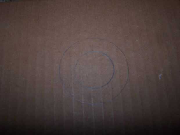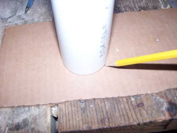 Tomar la pieza de PVC ahora aislada y se coloca sobre la hoja de cartón, traza con lápiz. hacer esto dos veces para 2 tapas. Ahora corte a lo largo de las líneas hasta que tiene 2 formas de donut. Agregue el pegamento a los bordes y coloca sobre la pieza más pequeña. Si esto es confuso, mira la foto.