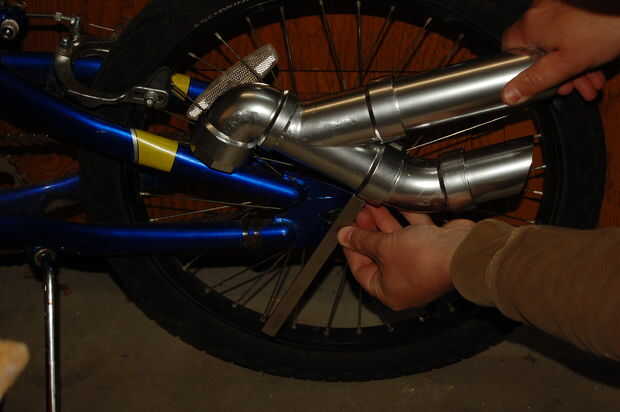 Retire la tuerca del eje trasero. Sostiene el silenciador en posición, marcar donde debe ir el agujero para el perno de eje. Este taladro con una broca un poco más grande que el eje.