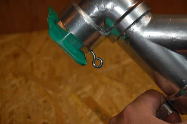 Marca la llamarada del buje extremo donde parece mejor y perfore con una broca un poco más pequeña que las roscas del lag en su perno de ojo. Enrosque el perno en el agujero.