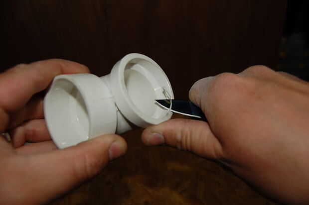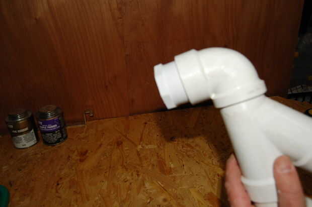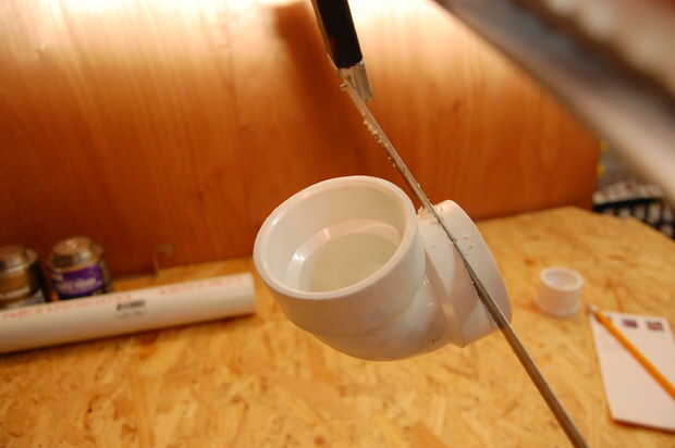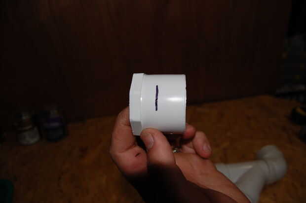 También cortar el manguito por la mitad. Esto debe completamente sin cortarse, pero es muy difícil de conseguir en y en PVC tiende a empujar hacia fuera mientras el pegamento seca. Quiere sobre ½" izquierda debajo de la parte hexagonal, suficientemente todavía un montón de pegamento, pero el hex ahora debe tocar la llamarada en el codo de 90 cuando se inserta.
