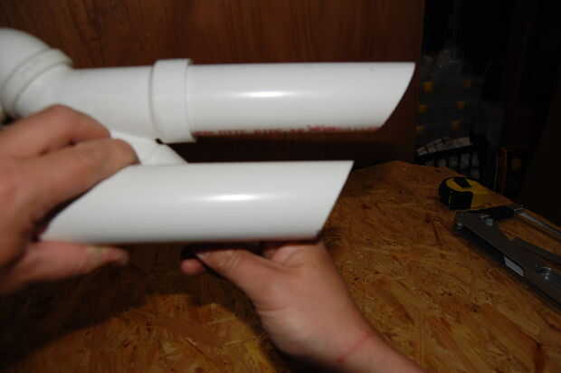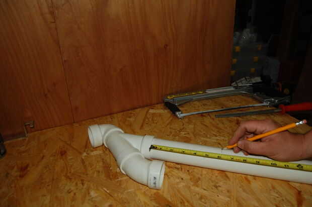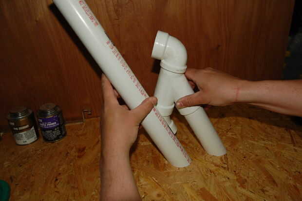 La parte ingeniosa es que usted sólo corta ambos extremos al mismo tiempo! Después de montar la pieza superior en la Asamblea, establece el extremo angular al ras en la mesa de trabajo. Coloque el resto de la tubería al lado de la Asamblea, extremo en ángulo hacia abajo y descarga al Banco. Guarnición solo derecho, y echando un vistazo la conexión inferior, puede ver donde debe cortar a continuación. Corte de ½" por encima del extremo de la conexión.