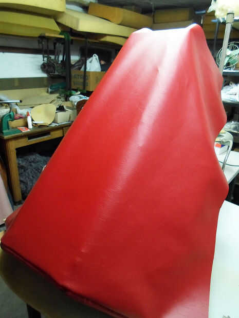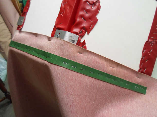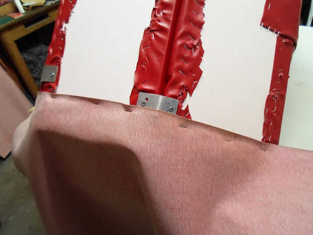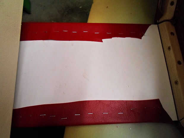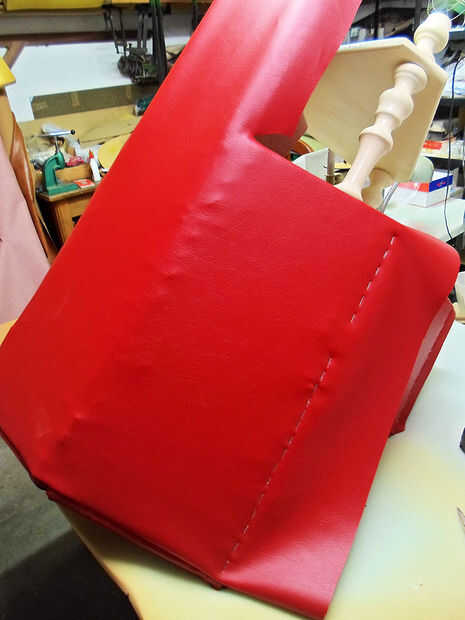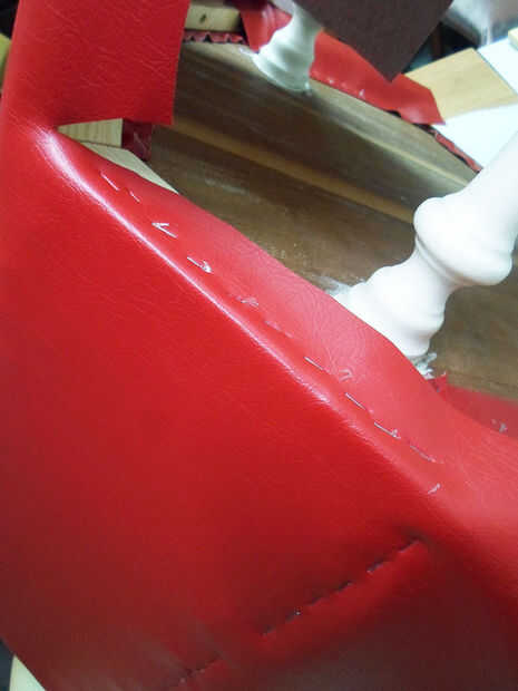 Mira las fotos para entender cómo cubrí la pierna trasera. Usted tendrá que doblar la tela superior a los lados de la pierna y grapas en la espalda (en realidad cortar algunos demasiado porque era demasiado).