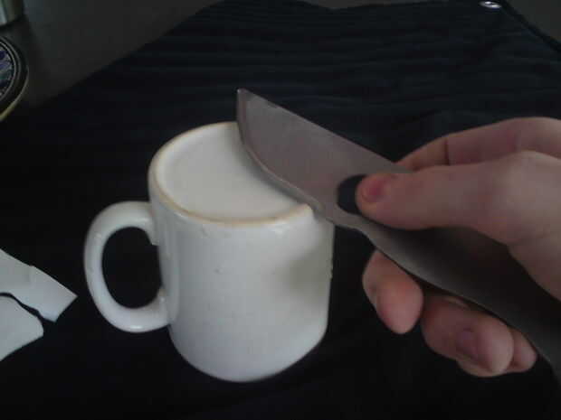 Para finalizar tus borde, deslizándose sobre el áspero borde expuesto en la parte inferior de una taza de porcelánico.