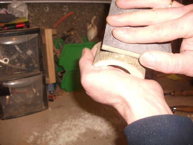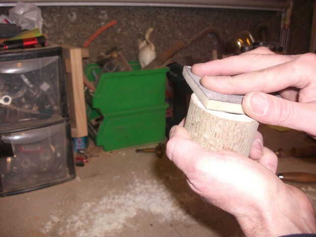 De la arena del fondo progresivamente utilizando papel de lija áspero, medio y fino, aunque la acabado no es demasiado importante, luego arena la parte superior dándole un acabado más fino, luego lijar ligeramente la lado para limpiar la corteza.