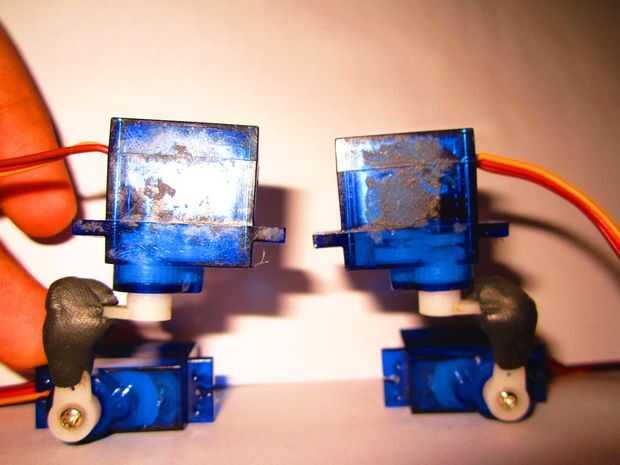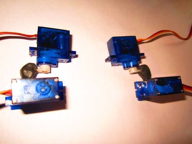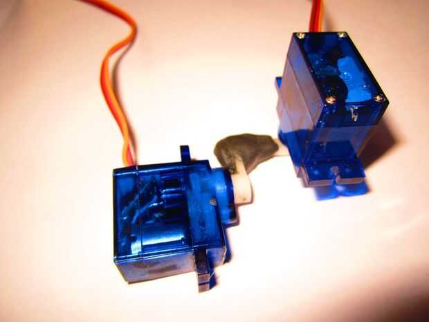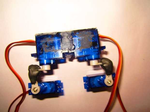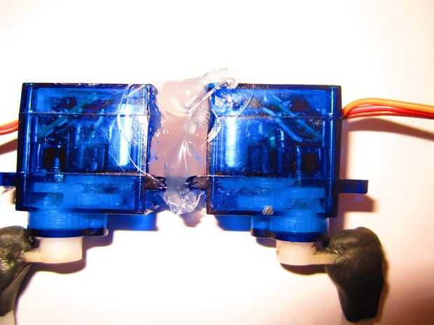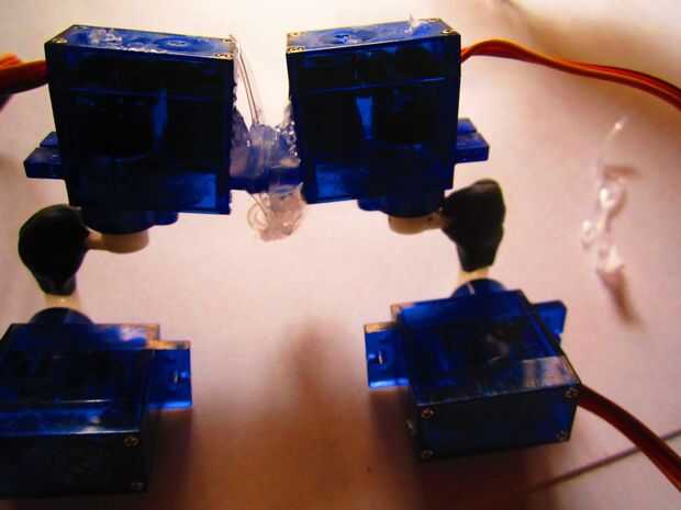 Utilice su epoxi/caliente-pegamento/Sugru para conectar dos motores perpendiculares entre sí como se muestra en las fotos. Hacer dos series de éstos. Cada sistema forma una pierna. Unir las dos piernas. Usé un pedazo roto de plástico para que las piernas se pegan plano y no en ángulo entre sí.