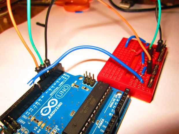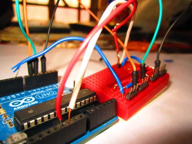 Ahora conectar los motores en el protoboard. El último perno en cada cable del motor es de color marrón que significa negativo. En la protoboard conectarse todos los pernos del lado izquierdo un perno negativo común. Del mismo modo conectarse todos los bolos de mediados positiva común uno de los pines. Estos pernos comunes están ahora conectados a Gnd (por negativo) y + 5V (para positivo) respectivamente. El primer pin va en los pines PWM de arduino. Si has usado el servo con un arduino antes de que encontrarás este paso muy simple de entender. Si nunca has usado de arduino y servo de antes te recomiendo que ver el siguiente enlace para entender mejor cómo funcionan.
