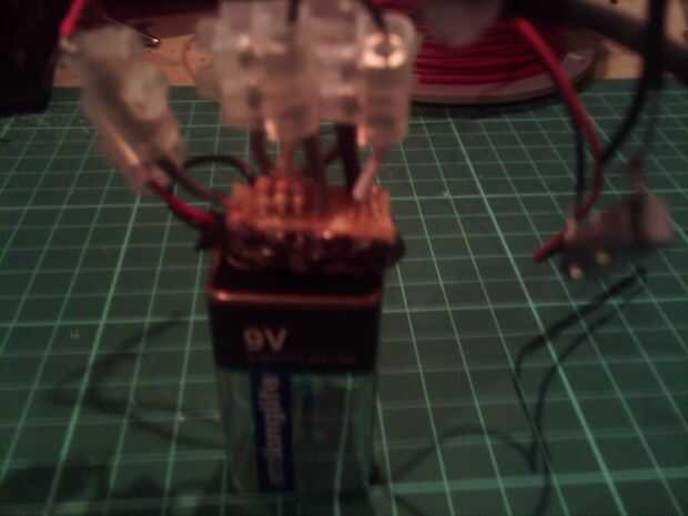Ahora todo lo que tienes que hacer es poner juntos. Sugiero a partir de las resistencias, luego los tiristores, luego clip de la batería y finalmente los LEDs. Yo solo soldar algunos cables cortos para la Junta de los componentes y algunas terminales de tornillo, así que puedo montarla en el cohete más fácil y para fijar un mecanismo de liberación del paracaídas real. Puede hacer esto colocando un servo o incluso un pistón a donde el LED rojo sería normalmente, pero probablemente haré otro tutorial que muestra cómo hacer eso. Cuando haya terminado, asegúrese de que controlar el circuito, ya que la batería y el tiristor pueden sobrecalentarse si hay un corto en este circuito. Una vez que lo tienes todo hecho, usted puede pensar acerca de lo que cabe dentro de un cohete. Caliente había pegado el curcuit sobre el clip de la batería para que se sientan encima de la batería y acortar algunos de los alambres. A continuación, Monte el sensor de inclinación en algún lugar por lo que está de pie erguido. Mina había montada en el lado de la batería, aunque podría ponerlo casi en cualquier lugar. Asegúrese de que probarlo para asegurarse de que es la manera correcta. Cuando se hace, debe tener algo que se ve algo como esto: