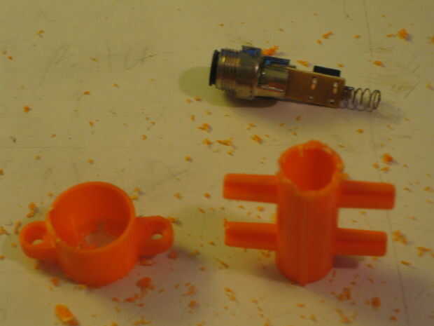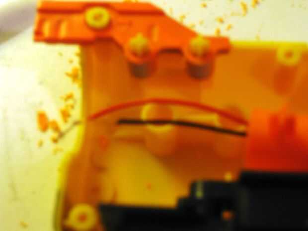 después de cortar, deslizar los cables de nuevo en la + pedazo de firmar y poner el extremo cortado hacia la carcasa de la batería.