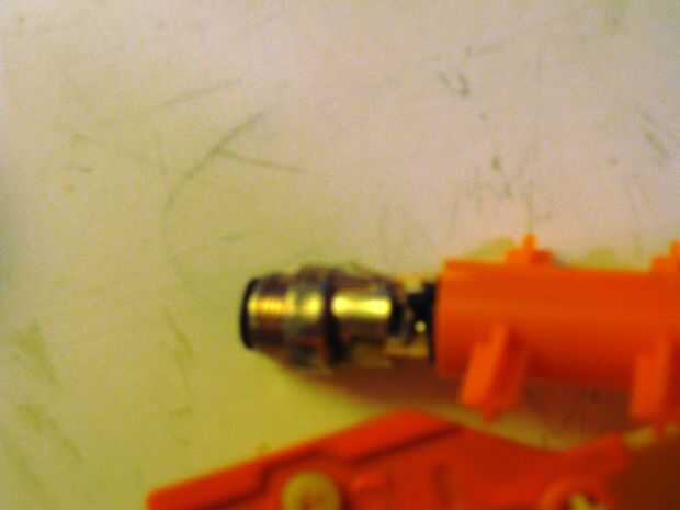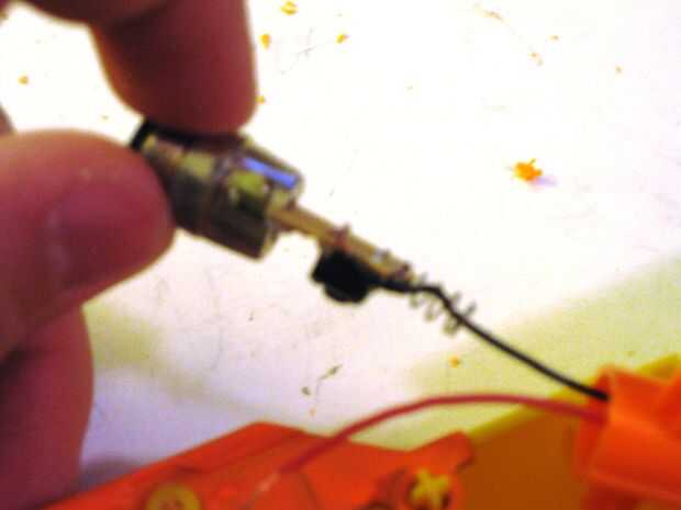 luego tomar pelados del cable rojo y el dispositivo láser y colocar el cable rojo por lo que está tocando la cabeza metálica (no a la rosca, pero la pieza redonda de metal antes de) y a la cuña en la naranja signo + pieza.