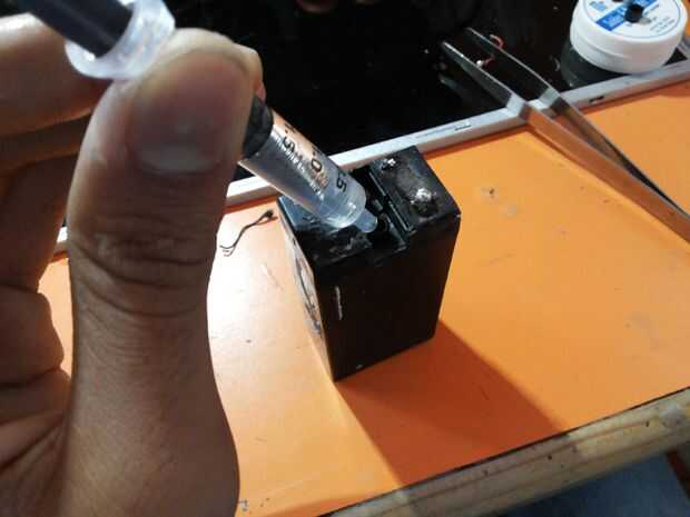 Ahora, como tienes una batería descargada, es el momento de recuperarlo. Como dije antes la mayoría de los batterys SMF muerta porque sus ácidos se secan. para recuperar la batería muerta, nos pondrá algún ácido de la batería de automóvil diluido con agua destilada. Ver fotos. Verás, primero el voltaje de la batería era de 0.1V, después agregar el ácido y recarga, el voltaje aumenta hasta 4.1 V. Mientras que recarga el ácido parece hervir pero no una cosa preocuparse es la parte del proceso de recuperación. Y una cosa mas en cuenta, cuando la batería se recupera, no da rendimiento 100%, reducirá a aproximadamente el 75% dependiendo de la calidad de la batería. pero su ok para correr carga pequeña de un pod. Poner la batería para cargar y pasar al paso 2.