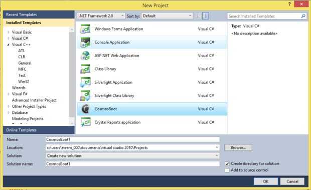 Seleccione arranque del Cosmos en la lista de C# plantilla. Si no puede encontrar Cosmos arranque en la lista de C# plantilla, leer a la guía: