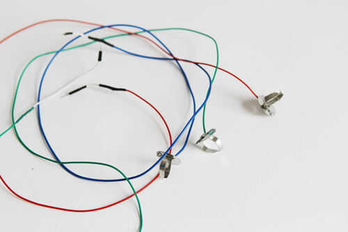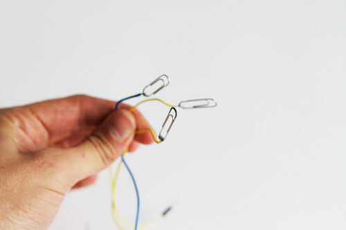 A continuación, cortar tres longitudes o unos 40-50 cm cada uno; tendrá la longitud adicional de la libertad de movimiento. Pele los extremos y esta vez carpetas de papel en uno de los extremos de cada alambre de la soldadura. El otro extremo se colocará en el protoboard.