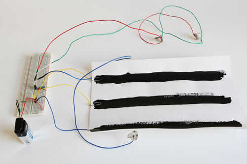Todo ahora debe ser conectado como se muestra en la foto de arriba. Para probar los LEDS internos, toque los cables de control deslizante en las diferentes franjas de pintura. Cada alambre deslizante debe corresponder a un LED interno.