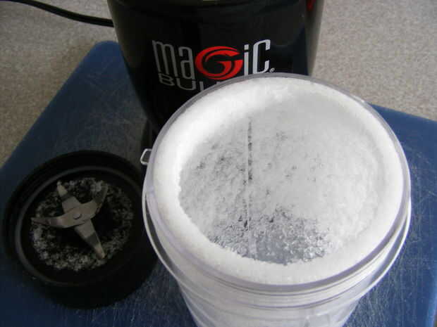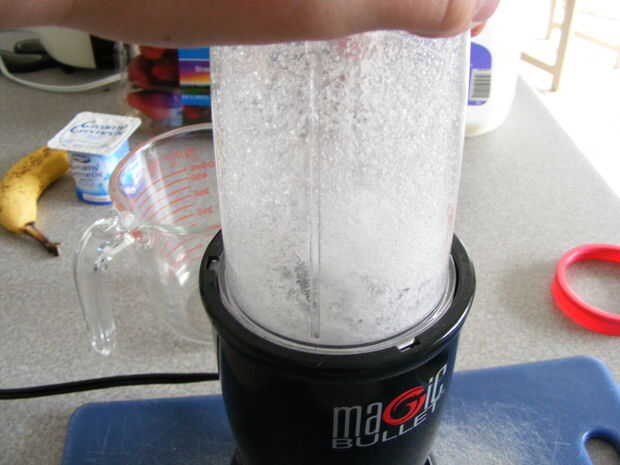 Luego, enchufe la licuadora y empuje hacia abajo! Puede que necesite para la licuadora poco a poco. ¿Utilizamos dos cubitos de hielo para que rebote más y golpear el disco, para que funde más suavemente (permítame decir "más" más? Ooops, acabo de hacer)