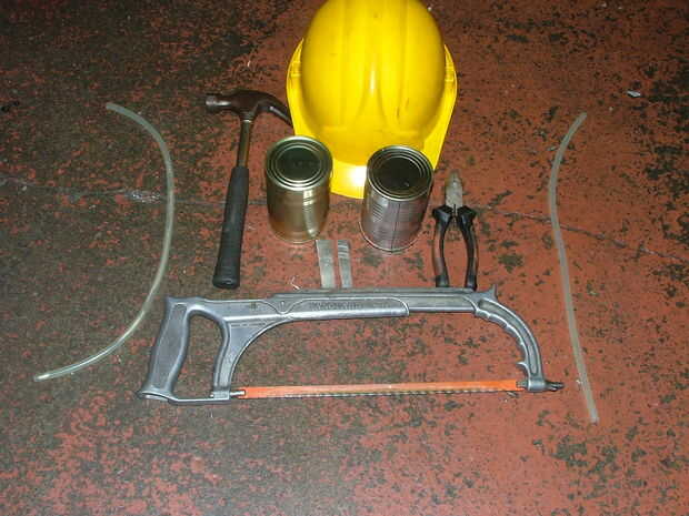 Necesita un casco, dos longitudes de la tubería alrededor de su boca hasta la mitad para arriba del casco, dos latas de sopa (lavados), 2 tiras de metal de 2cm de ancho, un par de grandes pinzas, un martillo una sierra para metales, grapas, Covers para la fijación de la tubería.