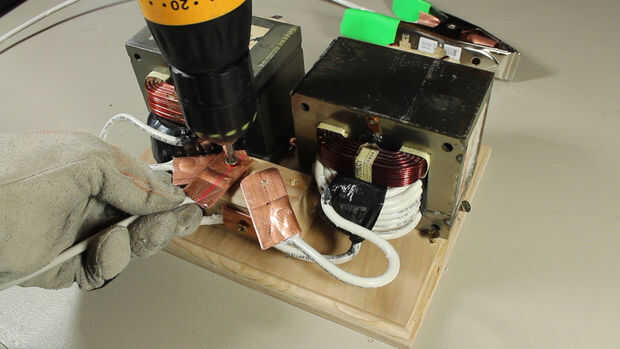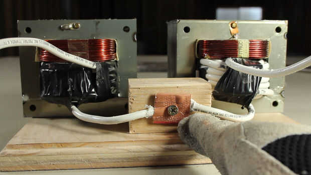 También empalmar el cable entre los dos transformadores y conectado les a una lengüeta común por lo que podría tener la opción de tap del centro los transformadores para futuros proyectos, como encender un horno de arco por ejemplo.
