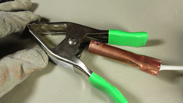 Había doblado un pedazo de tubería de cobre al alambre, y asegurar el tubo a la abrazadera con un tornillo. Para ser tan barato, la abrazadera tuvo una sorprendente cantidad de fuerza de sujeción, que era genial para morder en la pieza de trabajo.