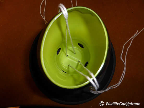 Cortar dos tramos de 1m de cadena. Enrosque cada extremo de un trozo de cuerda para arriba a través de los agujeros de la bandeja de goteo y luego a través de los agujeros correspondientes en el vaso. Repita con el otro trozo de cuerda y los orificios restantes.