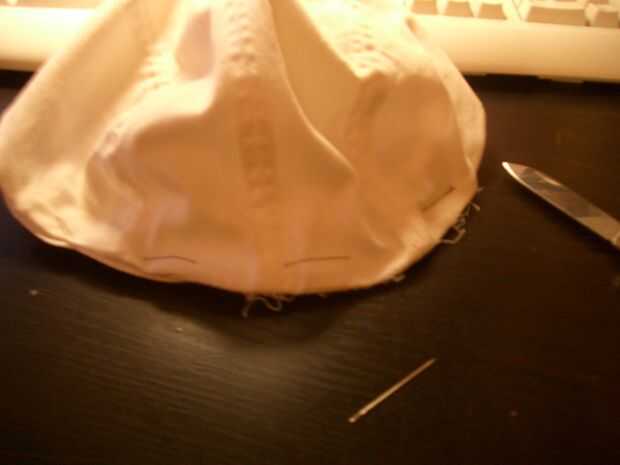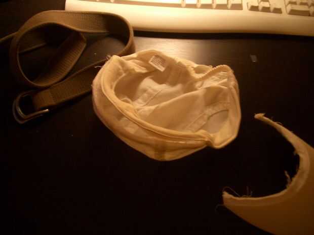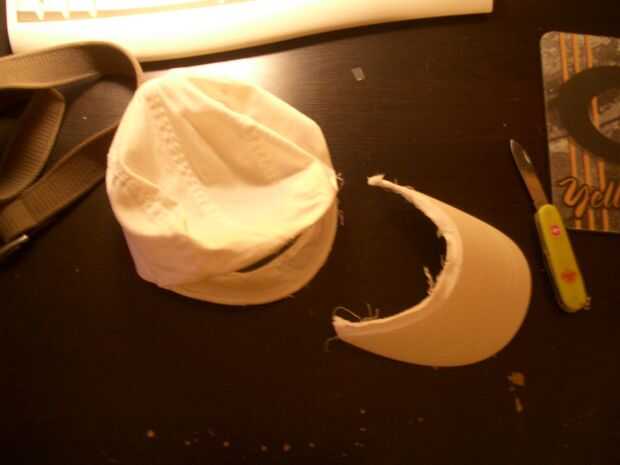 Este Instructable es construido en tres partes principales. El sombrero, las aletas del oído y la corona. Primero que desea hacer el sombrero. Tomar su gorra de béisbol y cortar el borde de él. No basta con echar tijera un corte, voltee hacia abajo y cortar el hilo que sostiene el borde sobre. Rasgar el borde de la tela, que usará más adelante en el proyecto. Debe haber un agujero gaping grande en el frente. Tomar el hilo y la aguja y coser encima de.