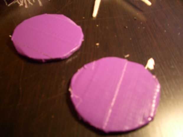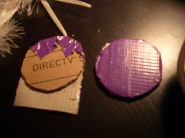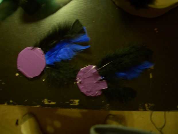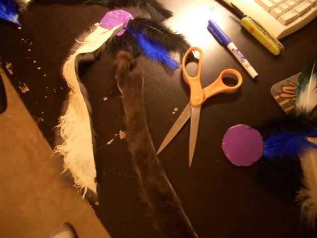 Ahora que van a hacer las aletas del oído. Tome su cartón y traza dos círculos (yo usé mi botón fácil). Corte los círculos hacia fuera y cubren en cinta de pato. Ahora tomar a seis de sus mullidas plumas y coincidir por tamaño y forma. A continuación tomar tres de los seis (yo escogí dos negros y uno azul) y cinta o pegamento en la parte posterior de los discos. Repetir. Ahora toma tu pelt (piel de conejo o ardilla) y cortar dos tiras iguales. Tomar las tiras y pegar en la espalda de los discos. Ahora has completado las aletas del oído.