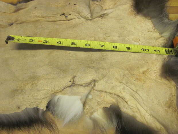 Entonces tome sus medidas antes de cortar cualquier parte de la piel. Para el estilo de hombre de la montaña con un pellejo de zorro, me mida 12" desde la base de la cola y marque la línea con un bolígrafo. (Para las pieles más grandes como el coyote, usted puede elegir hacer el cobertor más en la parte posterior) Pero seguro que deje suficiente espacio para marcar el resto de su patrón, como veremos en el siguiente paso.