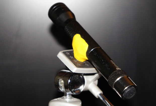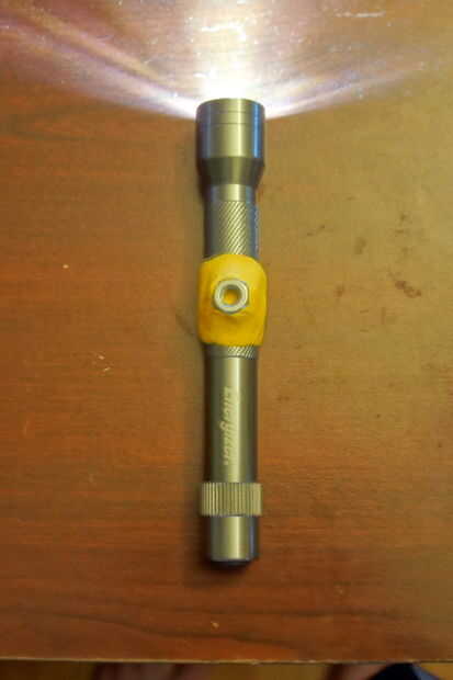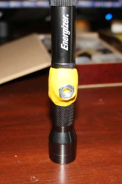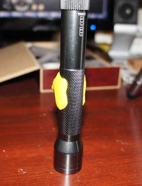 Simplemente molde sugru alrededor de la linterna. No tiene que ir totalmente alrededor, pero no estar seguro de que era más 180degrees entonces por lo que sería una Unión más estrecha. También ayuda a encontrar el punto de equilibrio de la linterna en primer lugar. Hacerlo con pilas para asegurarse de que equilibra adecuadamente. hace más fácil a la luz en el correcto ángulo cuando su uso.