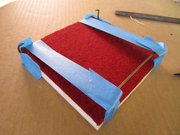 Poner todas las piezas de alambre en la placa de soporte y ajuste de prueba de la tableta.  será un poco complicado con el alambre no pegado todavía.  Usted está buscando las guías de alambre sujetar firmemente la tableta pero no rayar o arrastre en la tableta.  Puede ajustar el alambre con los alicates hasta que tenga un ajuste que más te guste.  Pegue los cables en los agujeros con pegamento.  Use cinta para fijar todo lo que se está secando.