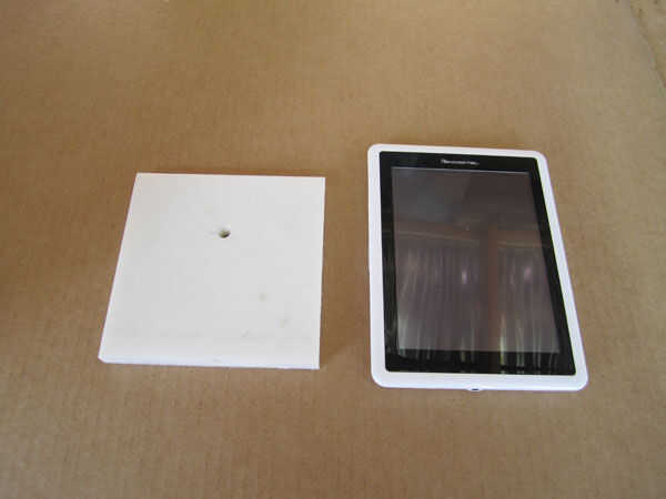 Primero corte la madera plástica para la placa de soporte de la tablet a la anchura de la tableta y 2/3 de su altura.  Perfore un agujero de 7/16" en la placa de soporte.  Centro entre la izquierda y derecha y 2/3 de la altura de la placa.  El agujero debe estar en el centro de la parte posterior de la tableta cuando se alinean el borde inferior de la tableta y la placa de soporte.  Toque en el agujero para roscas de 1/4".  Si no tienes un grifo que solo podía perforar el agujero de gran tamaño y pegar el cuello en.