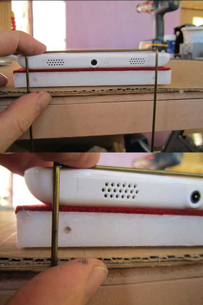 Marque en los agujeros inferiores y doble cada extremo para que se gire y encajar en los agujeros. Recorte los extremos para encajar en los agujeros.