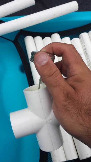 Comenzar aplicando un cemento de PVC en el interior del conector en forma de X. Antes de insertar cualquiera de los tubos, poner algún cemento en los extremos que se van a la diapositiva en el conector. Esto asegurará una conexión buena, sólida. (Es una buena idea que fuera, o en un área bien ventilada, antes de usar cemento de PVC. VAPORES!)