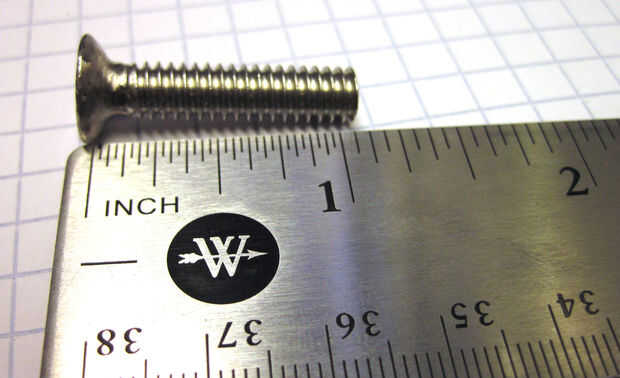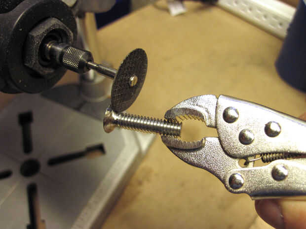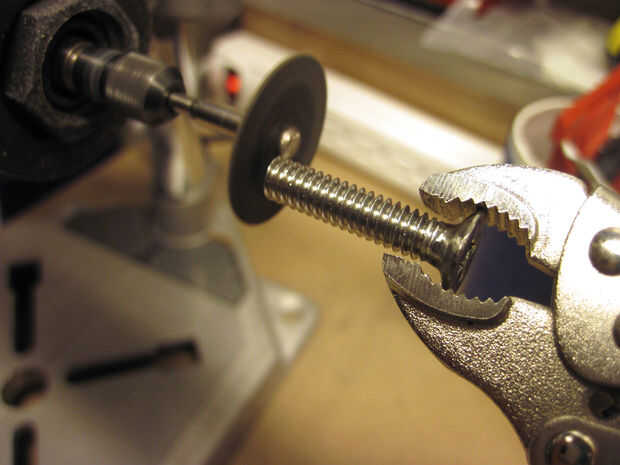 -Utilice una broca de corte para moler lejos de la cabeza del tornillo con bridas. El tornillo se pondrá muy caliente. Sujetarla con pinzas, guantes, vice apretones, nada que separe los dedos y el calor de fricción. Gire el tornillo para cortar uniformemente el Temple extra. Parar de vez en cuando para comprobar si ha eliminado suficiente material.