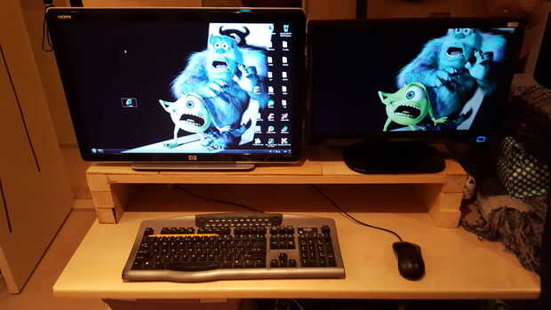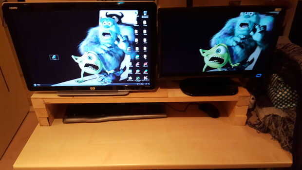 I aserrado los polos a 30 cm y apilar los 3, para tener 15 cm de espacio libre para almacenar mi teclado y el ratón. Usé unos 2 × 3 cm barras para apoyar el tablero en la parte superior. En total el monitorstand es de 15 cm de alto, 90 cm de ancho y 30 cm de profundidad.