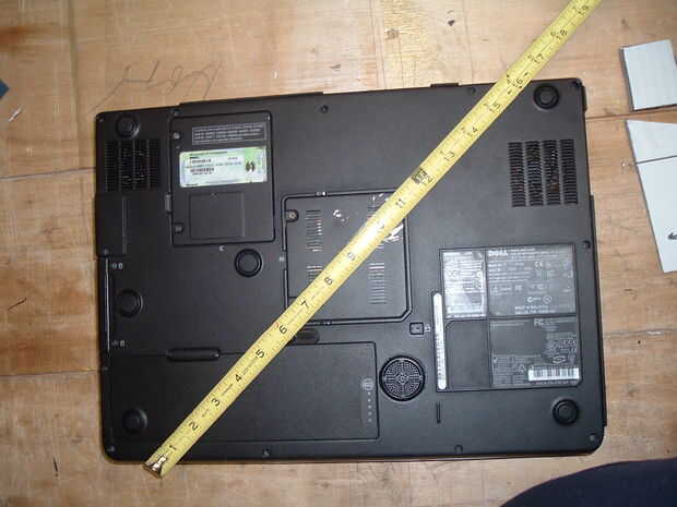 La segunda medida importante es la longitud al estar respaldado por el soporte. Medir diagonalmente a través de la parte inferior de la portátil, empezando y terminando aproximadamente 2 pulgadas en el borde. Ajuste esta diagonal según sea necesario para evitar golpes, pies y otras protuberancias de la parte inferior del portátil. En mi caso, la medida fue 15 1/2 pulgadas.