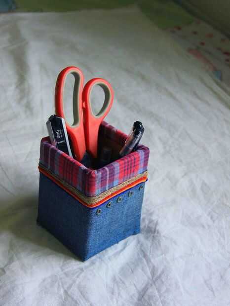 me encanta usar mis cosas viejas para hacer nuevas things.its muy divertido convertir tus cosas viejo en algo nuevo. Para hacer este sostenedor de la pluma usé mi camiseta vieja y puede mezclilla vieja. Usted y otros vieja camisa, camiseta o cualquier otra cosa.