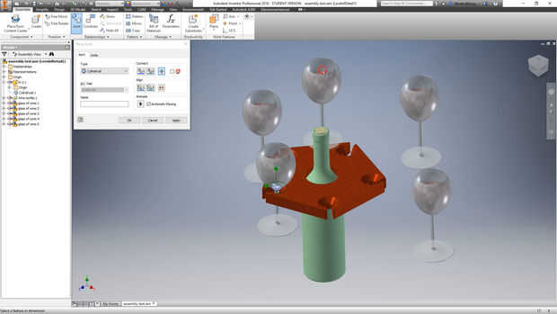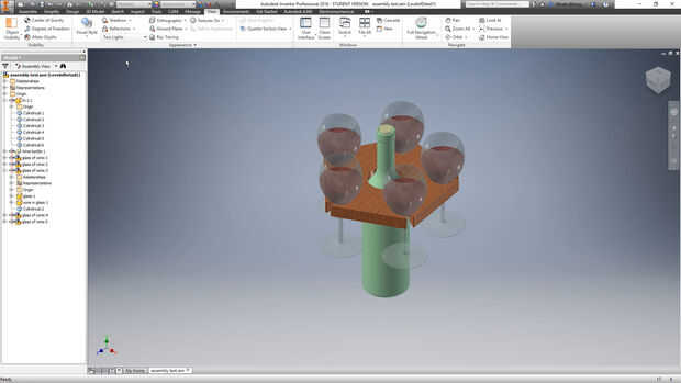 Luego buscaron a través de mis archivos de diseño y encontrar un modelo de una copa de vino y una botella que yo había diseñado para un proyecto pasado, importados en el entorno de ensamblaje de inventor y comenzó a agregar las relaciones de parte al caddy en la botella de vino y las copas en sus lugares de asiento. Luego configurar el tipo de vista a 'realista' para obtener una representación agradable aspecto de producto final como se verá. Una vez que estaba contento con me mudé a CAM.