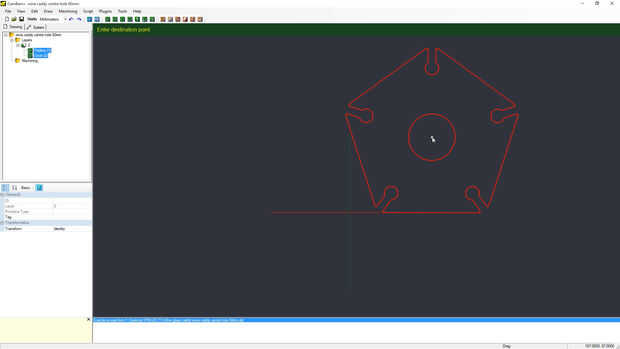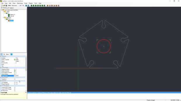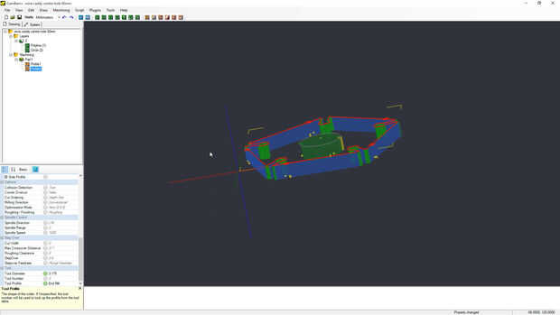 El siguiente paso fue tomar un esquema de dxf de la parte (Asegúrese de suprimir las funciones chaflanadas antes de mano) y caer en CamBam. Desde aquí produje un interior perfil corte el orificio central y un exterior de corte para el perímetro y añadido algunas pestañas de sujeción.