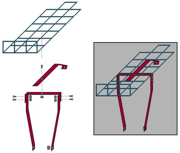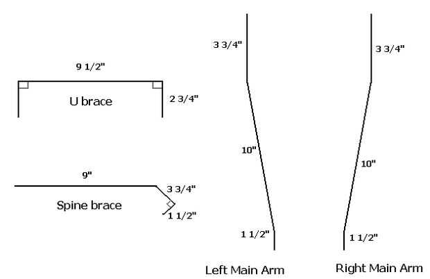 La estructura es de 4 piezas: las principales armas, que la mayor parte del peso y se unen al eje trasero de lado, el soporte de la U, que une los brazos, y el soporte de la columna vertebral, que todo eso a la estructura. Las mediciones de estos cambiará basado en cuál es el tamaño de las llantas de su bicicleta y lo que te será ancho del rack.