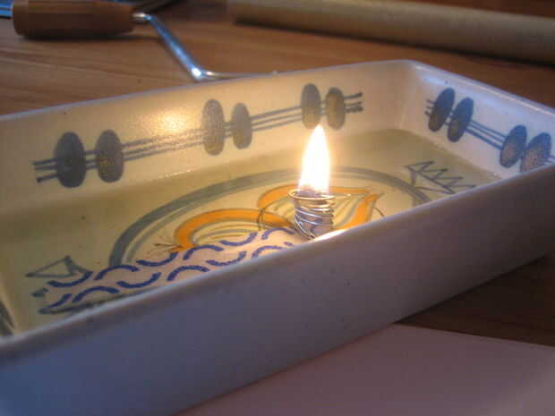 coloqué algunos aceite de colza en un recipiente poco profundo cuando quema aceite vegetal es mejor tener un recipiente poco profundo, amplio, en lugar de un vaso alto porque el aceite no se mecha arriba como fácilmente como más fino aceite de la lámpara tales como aceite de parafina. Aceite de colza quemaduras limpian y caliente y es muy baratos. Empapar la mecha por un par de minutos antes de iluminación-iluminación no es tan instantáneo como una mecha de la vela de cera pero se encenderá.