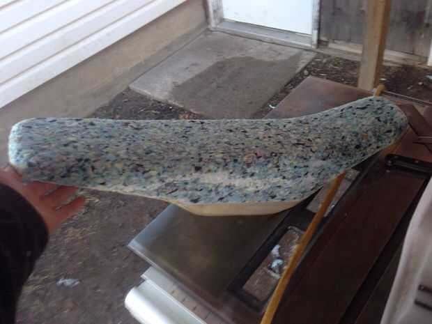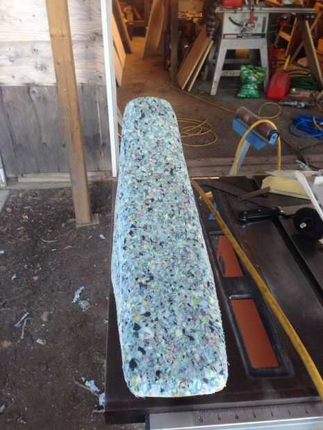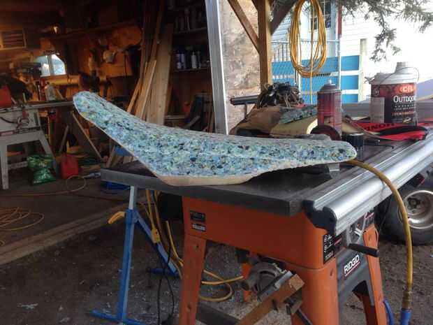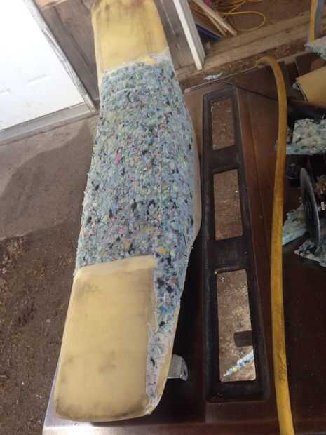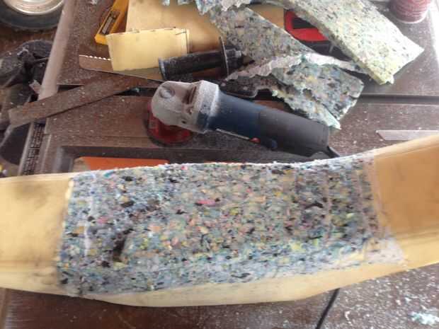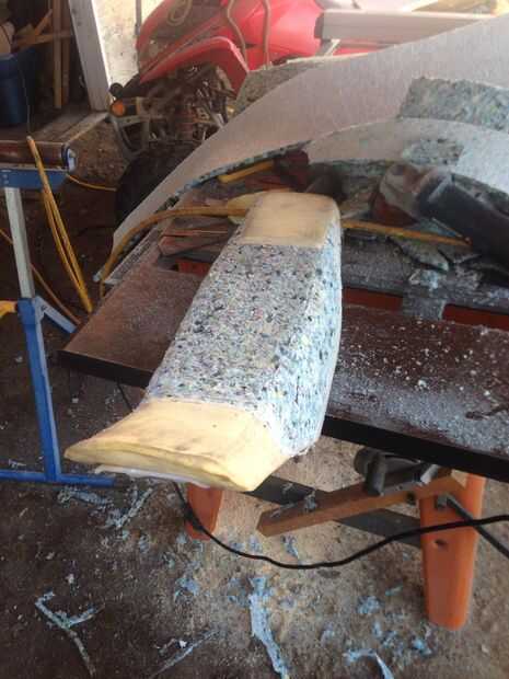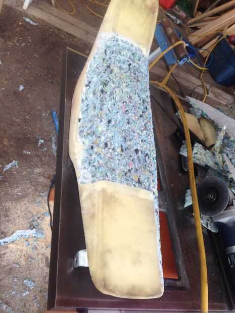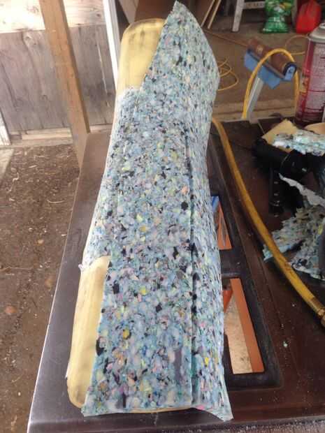 3 M spray de pegamento adhesivo se usa para pegar la espuma nueva en. Una estándar de 4" amoladora angular equipada con un cierre de disco fue utilizada para tallar y forma.