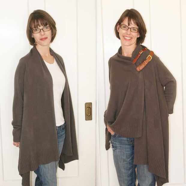Me encanta este Jersey drapey viejo que tengo, pero no había manera para mantenerlo cerrado para evitar que mi caliente! Pensé durante mucho tiempo acerca de cómo agregar un botón, pero eso significaría molestar con un ojal. También pensé acerca del uso de algunos cierres inusuales como ranas o hebillas. Entonces vi este Jersey impresionante en una tienda de moda de gama alta y sabía que tenía mi respuesta.