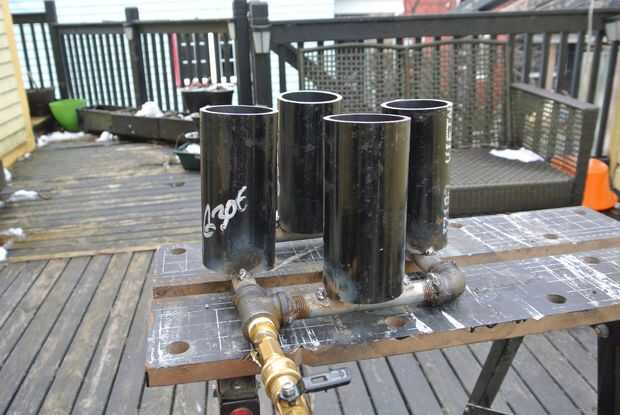 Centro sobre los orificios orificio de los tubos del quemador, quieres los agujeros directamente en el centro de los tubos. Soldadura o soldar los tubos del quemador en lugar. Si usted les es soldadura en lugar es probablemente es una buena idea de moler hacia fuera de los tubos de 3" con medias lunas por lo que encajan en las tuberías de 1/2". Esto permitirá que más superficie de contacto de la soldadura.