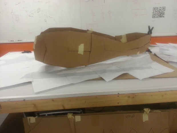 OK, así que las medidas de Mabel (amigo apodado que) son de 5 pies de nuca de cuello a la punta de la mandíbula y aproximadamente 2 y un medio ancho en la parte posterior de la quijada. Eso es un montón de papel tuve las piezas impresas por una impresora, montado en las piezas y entonces comenzó a trazo sobre cartón.